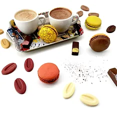 £10: A hot drink, 3 macarons, a chocolate bonbon and treats from our snacking range.